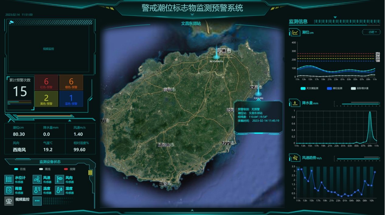 警戒潮位监测系统主要由80GHz雷达水位计、风速传感器、风向传感器、雨量计、大气温湿度传感器、大气压强传感器、北斗定位终端、北斗通讯终端、四色水位报警灯、扬声器、标识柱、设备支架、设备防水箱、通讯电缆、分析计算软件、电源配套系统、基础设施施工和物联网监控平台等组成。